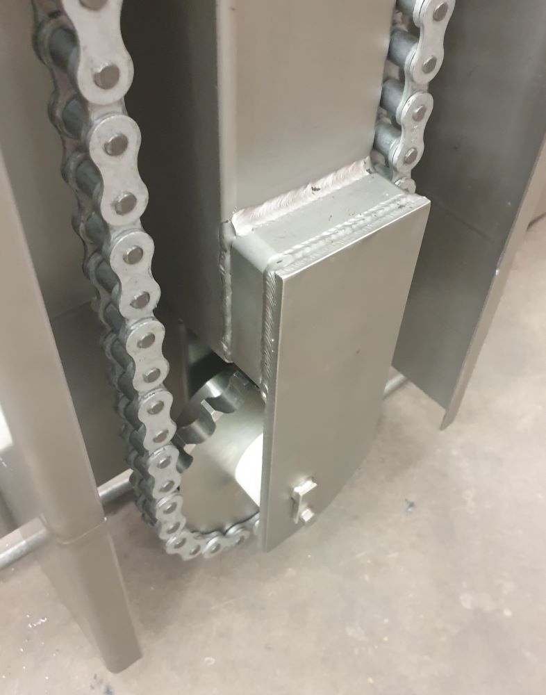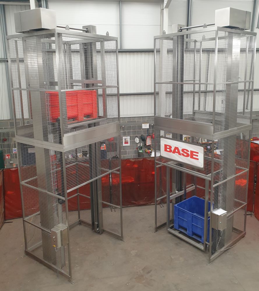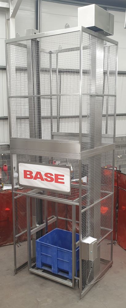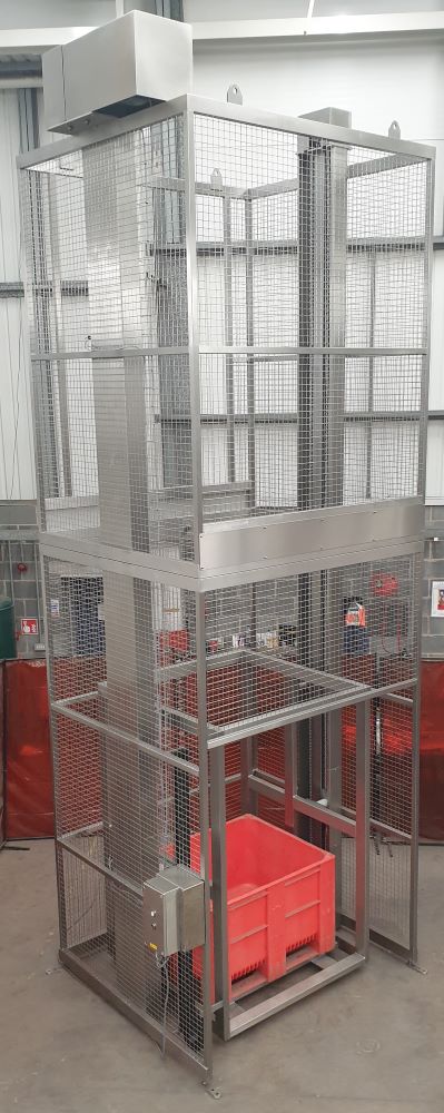 PLM/2P/1000/4000/B/G Dolaf Bin Platform Lift This Dolaf Bin Platform Lift had a Safe Working Load of 1000 Kgs to raise Dolaf Bins to a transfer conveyor at a lift height of 4000mm. The lifting platform was big enough to allow a Dolaf Bin Transfer Conveyor to be mounted on the lift carriage. The Dolaf Bin Platform Lift was manufactured from Grade 304 stainless steel and is a welded construction throughout. The machine is designed to be bolted to the floor without the need for a pit. The lifting is accomplished via chains driven by a motor gearbox mounted at the top of the one column with a crossover shaft to the other column. Dolaf Bin Platform Lift Electrical Control This Dolaf Bin Platform Lift was fitted with an IP65 Stainless Steel Terminal Box which was mounted on the safety guard at the lower level for the control to be completed by others. The following components were be wired back to the terminal box:- - 1 off Motor Gearbox & Brake