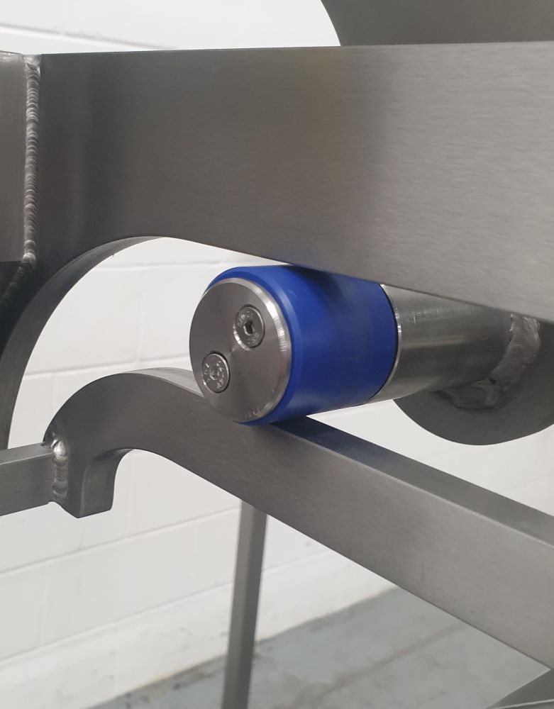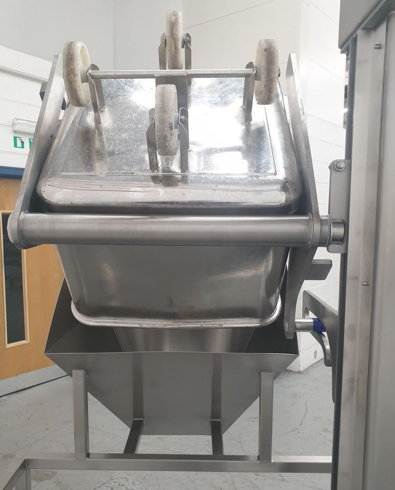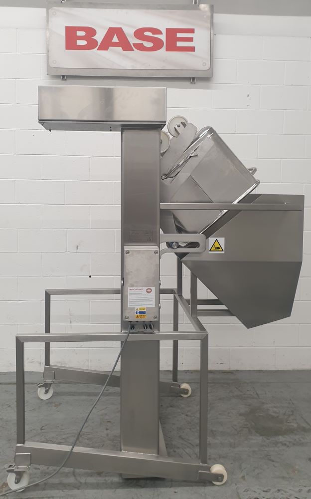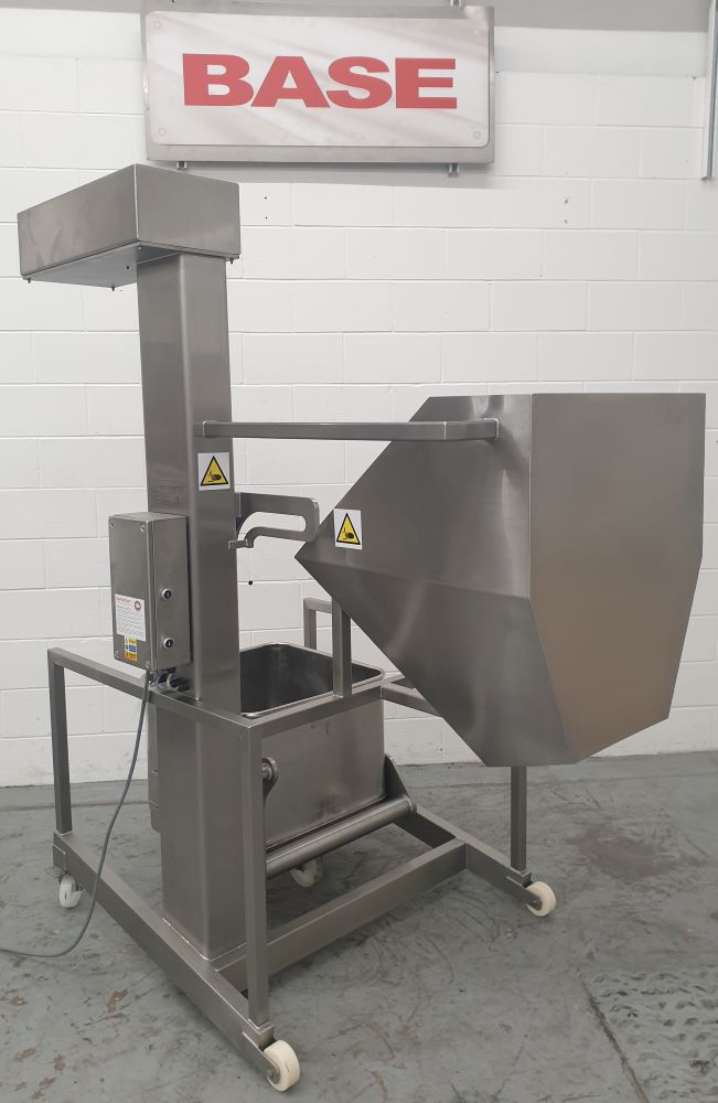 BTM/300/1350/M Dump Buggy Lifter Tipper The Dump Buggy Lifter Tipper was designed to lift and tip a 200 Litre Dump Buggy at a discharge height of 1350mm into an intermediate chute. The Dump Buggy Lifter Tipper was manufactured from Grade 304 stainless steel, is a welded construction throughout and is designed to be mobile on castors. The lifting is achieved by a ¾” Simplex chain driven by a motor gearbox mounted at the top of the main column. The unguarded machine is fitted with our unique safety latch which engages automatically in the extremely unlikely event of a lift chain failure. Dump Buggy Lifter Tipper Electrical Control The Dump Buggy Lifter Tipper was fitted with an IP65 Stainless Steel Control Panel mounted on the main column at a convenient position to give good maintenance access under the Provision and Use of Work Equipment Regulation 1998 (PUWER). Upper and Lower end of travel limit switches are positioned to prevent inadvertent adjustment or damage but are easily adjustable by trained personnel for fine adjustment on site. The unguarded Dump Buggy Lifter Tipper operates on a ‘hold to run’ principle such that the ‘Up’ or ‘Down’ pushbuttons must be held for the Dump Buggy Lifter Tipper to operate. As soon as either button is released, the Dump Buggy Lifter Tipper will stop. The control panel has a volt free pair of contacts which can be used to connect a ‘Call to Run’ signal if required.