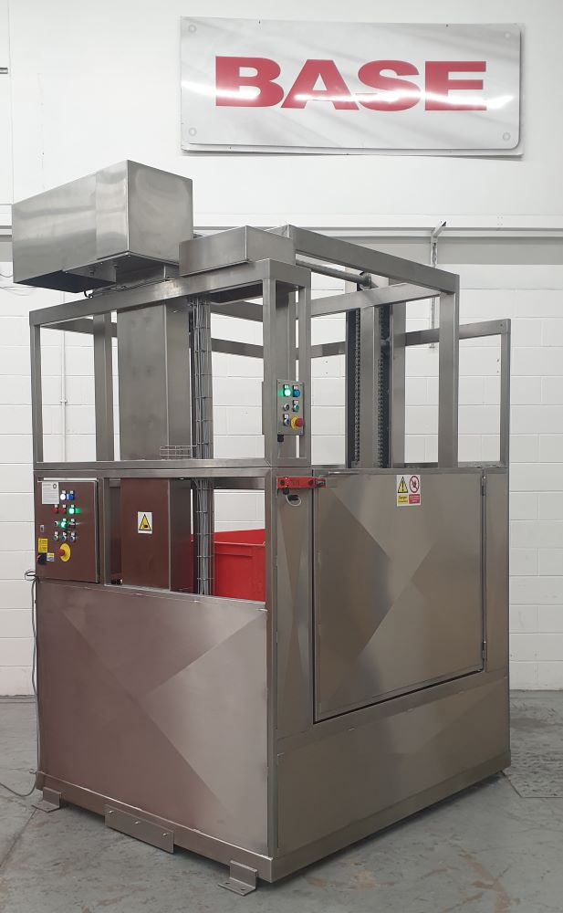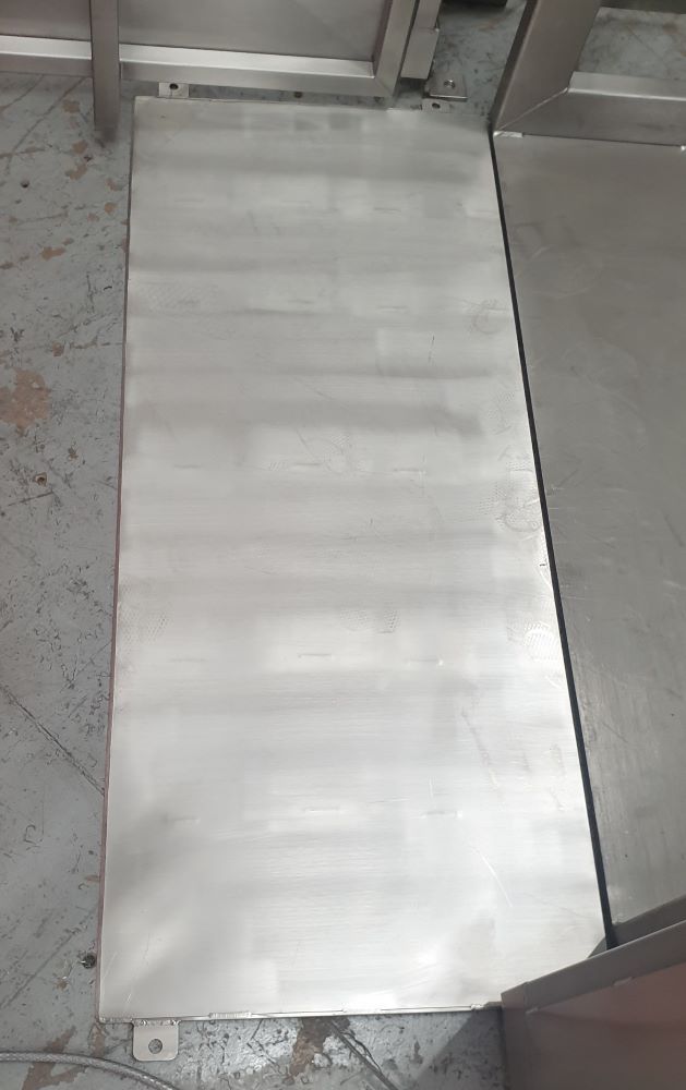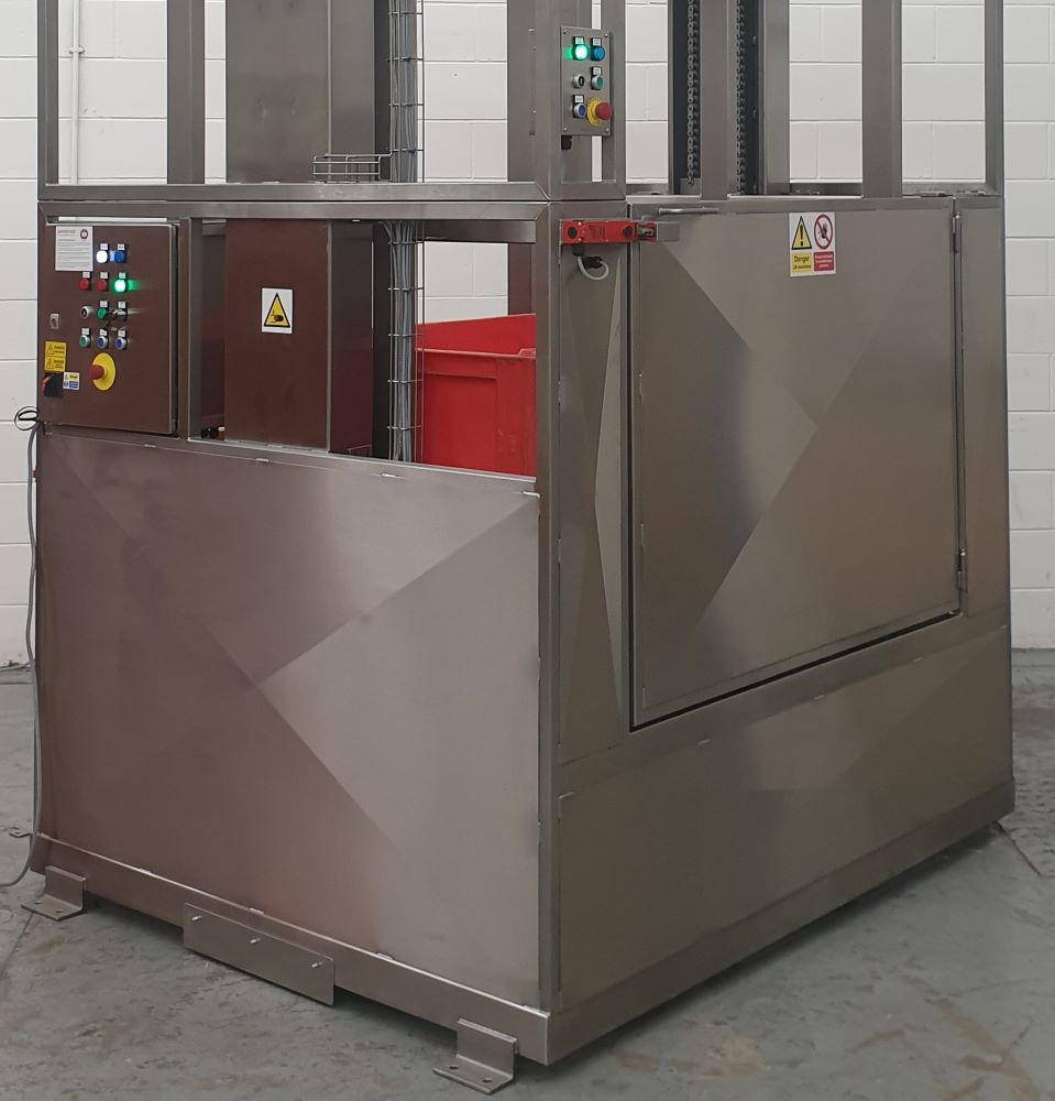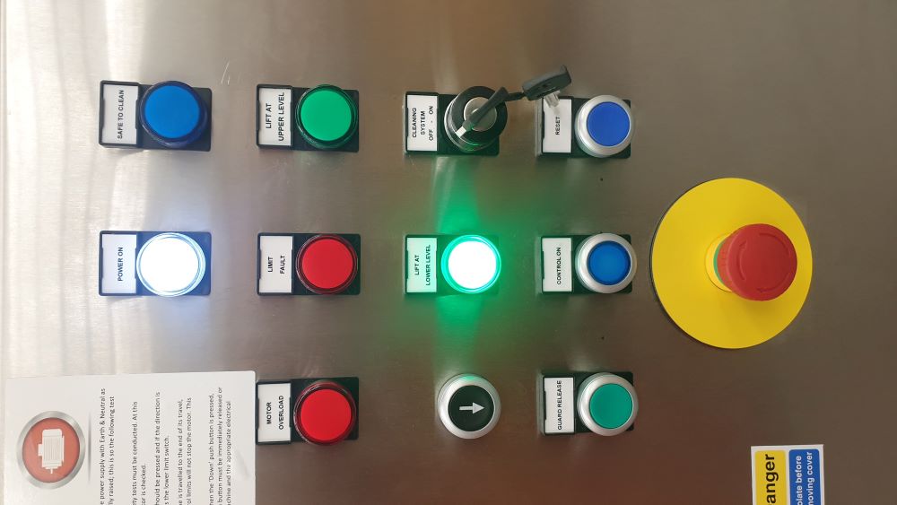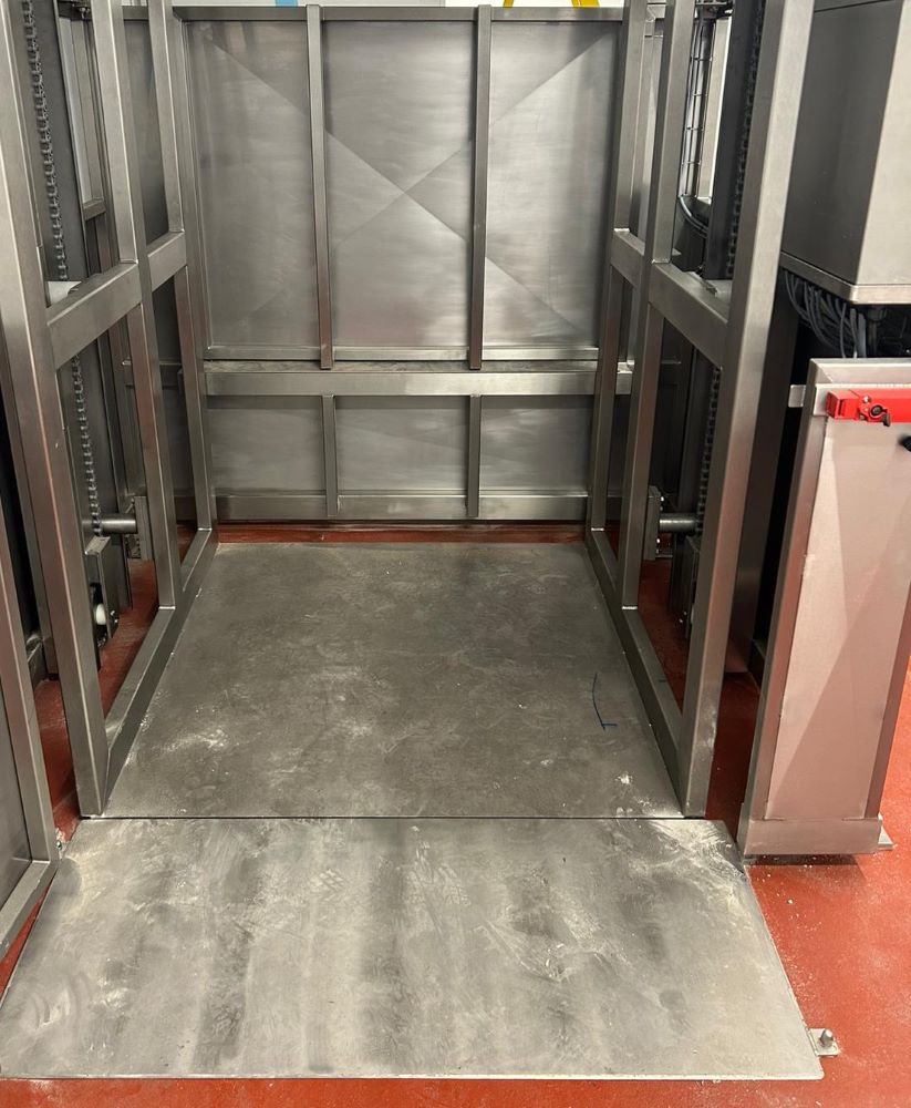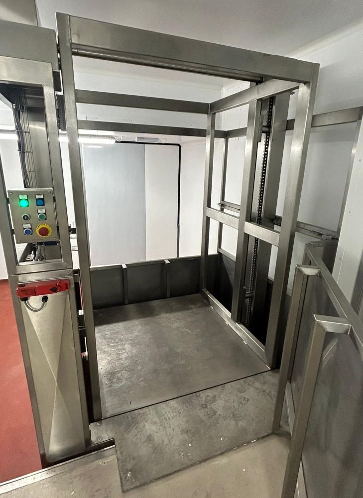 PLM/2P/1000/640/B/G Rack Platform Lift This Rack Platform Lift had a Safe Working Load of 1000 Kgs to raise a Rack (1200 Wide x 1000 Deep x 1940mm High) between floor levels with a height difference of 640mm. The lifting platform was 1400 x 1300mm to allow a standard pump truck to load a Rack onto the lift carriage. At the upper level, there was a landing plate to allow easy unloading. The machine was manufactured from Grade 304 stainless steel and is a welded construction throughout. The Rack Platform Lift was designed to be bolted to the floor without the need for a pit. The lifting is accomplished via chains driven by a motor gearbox mounted at the top of the one column with a crossover shaft to the other column. Rack Platform Lift Safety Guards The Rack Platform Lift was supplied with fixed low level guards on each side to a height of 1100mm and hinged gates at the loading and unloading positions. The safety guards were constructed from 40 x 40 x 3mm stainless steel box section and 2.0mm stainless steel sheet. At each level, there was a hinged door through which the machine can be loaded and unloaded. The doors are electrically interlocked to prevent the machine being operated with a door open and in addition, the doors are mechanically locked closed whilst the machine is running. Each door may only be opened when the lifting carriage is at the appropriate level. Rack Platform Lift Electrical Control The Rack Platform Lift was fitted with an IP65 Stainless Steel Control Panel mounted on the machine at a convenient position to give good maintenance access under the Provision and Use of Work Equipment Regulation 1998 (PUWER). The control panel incorporated the following controls; Up, Guard Release, Emergency Stop and a Reset Facility. There was a remote Stainless Steel push button station at the upper level incorporating the following controls; Up, Guard Release and Emergency Stop. Dual Upper and Lower end of travel limit switches are positioned to prevent inadvertent adjustment or damage but are easily adjustable by trained personnel for fine adjustment on site. The doors at the upper and lower levels are locked closed to allow the Rack Platform Lift to be operated and are released by a guard release push button at each level.