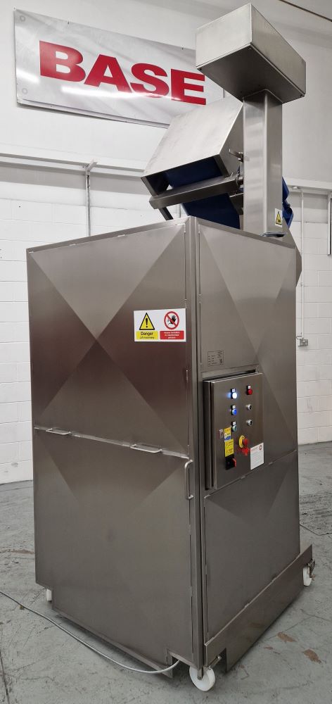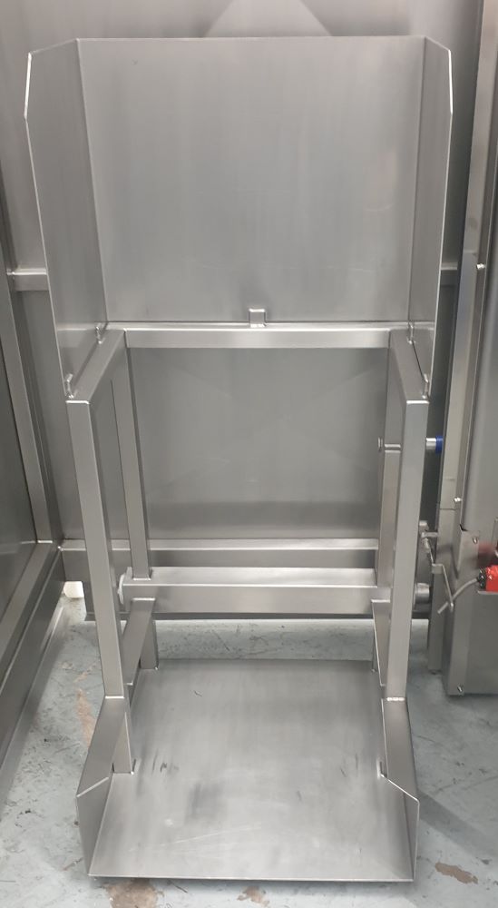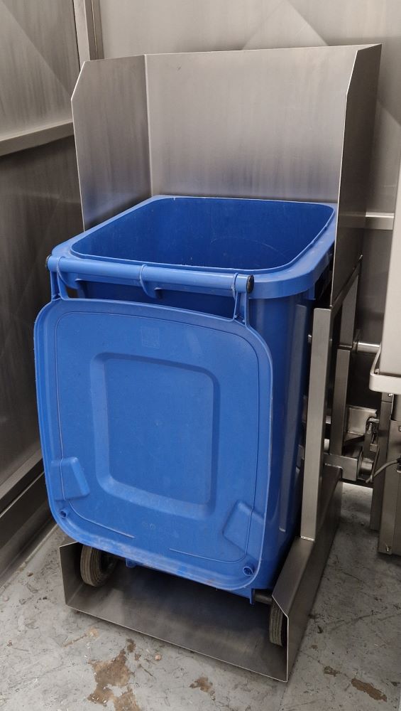 The Incinerator Wheelie Bin Tipper was supplied complete with a safety guard to meet the guidelines of BS EN 14120:2015 Safety of Machinery Guards. The safety guard is constructed from 40 x 40 x 3mm stainless steel box section and 2.0mm stainless steel sheet. It encloses the Incinerator Wheelie Bin Tipper to a height of 2200mm on two sides, 2000mm on the tipping side with a hinged guard door on the fourth side. The guard door is electrically and mechanically interlocked preventing the Incinerator Wheelie Bin Tipper from operating when the door is open. Additionally, the guard door can only be opened when the lift carriage is at the full down position to prevent access whilst a load is raised.