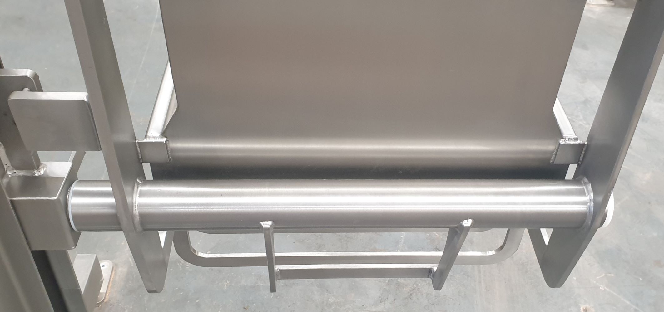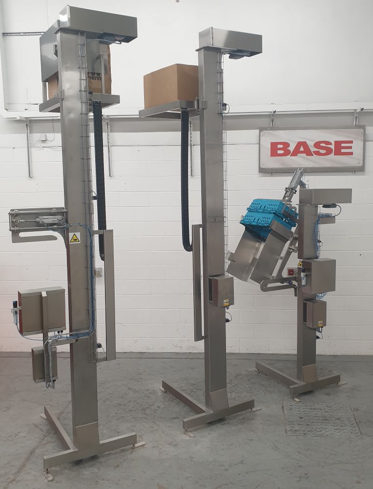 This Tote Handling System Tipper/Elevator was designed to lift and tip a Tote at a discharge height of 2225mm. It also elevated the Tote after tipping to a height of 3600mm to feed onto a roller conveyor. The Tote Handling System Tipper/Elevator was manufactured from Grade 304 stainless steel, is a welded construction throughout and is designed to be bolted to the floor. The lifting is achieved by a 50mm toothed timing belt driven by a motor gearbox mounted at the top of the main column.
