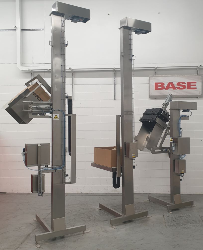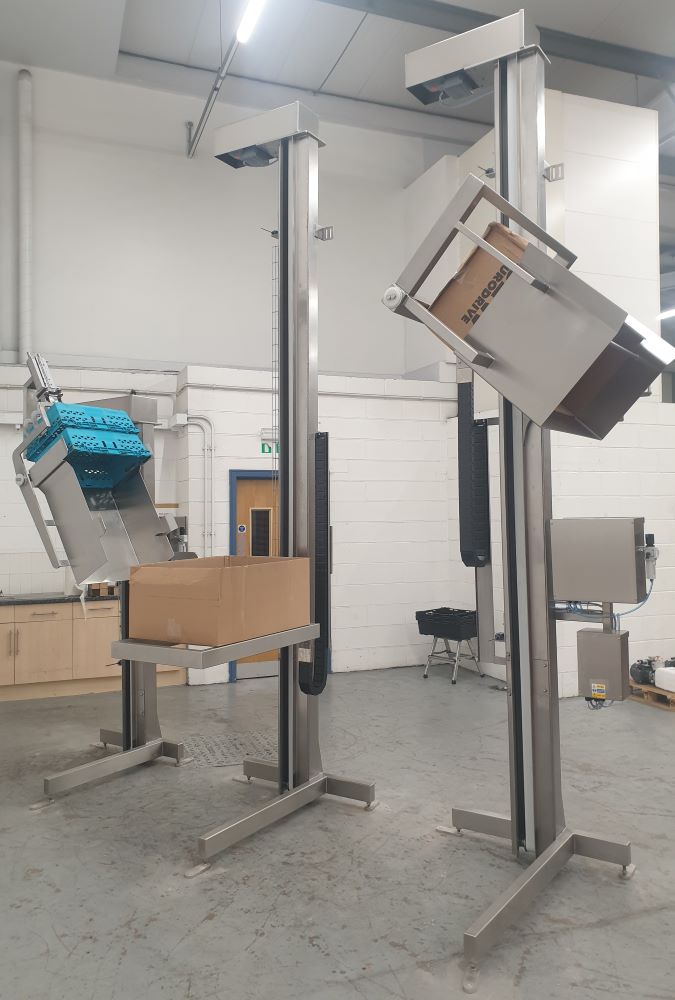 The plastic totes were loaded onto a powered roller track and driven into the lift carriage. Once in the correct position, the tote was lifted clear of the roller track with lifting arms at the base of the lift carriage and tipped into a conveyor hopper. The lifting carriage was fitted with a tipping chute to ensure that the parts are directed into the feed chute and to retain the totes in the tipped position. Once discharged, the totes were lowered back down onto the roller track to be reversed out of the lift carriage and transferred sideways onto the outfeed system.