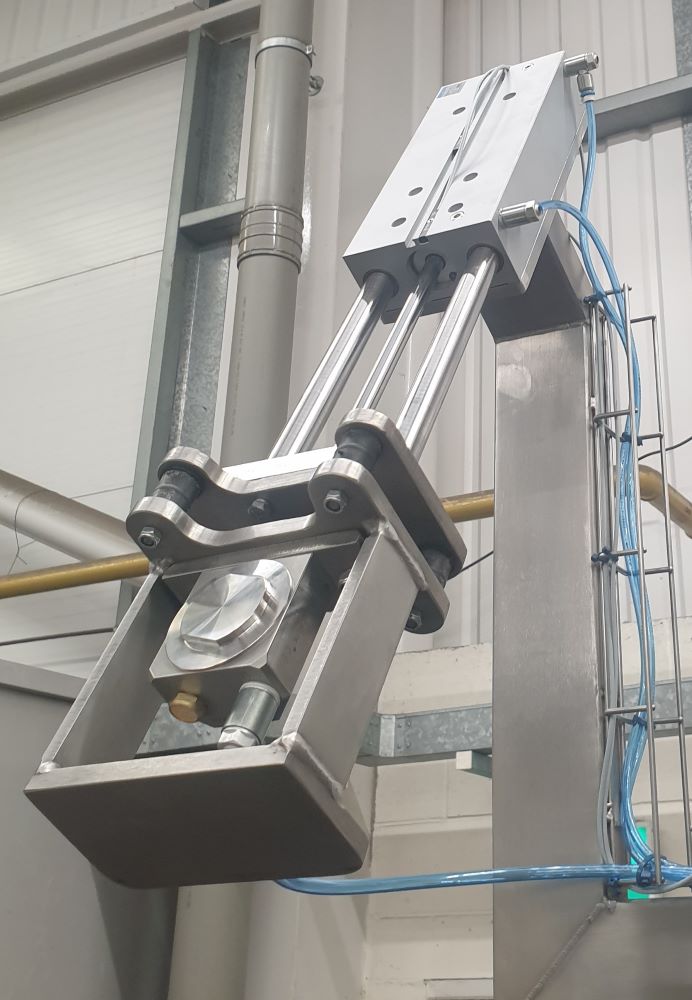 The Tote Handling System Tipper Elevator was supplied complete with a Drum Roller Conveyor mounted on the lift carriage so that the tote could be driven into the lift carriage from a transfer conveyor at the lower level height of 1205mm. Once the Tote was in the correct position, it was lifted and tipped at a discharge height to feed into a receiving chute. After the Tote was discharged, it was lowered back to the full down position. At the full down position, the tipping cam was retracted by a pneumatic cylinder to allow the Tote to be raised to the full up position. At the full up position, the Tote was driven out of the lift carriage onto the upper roller conveyor.