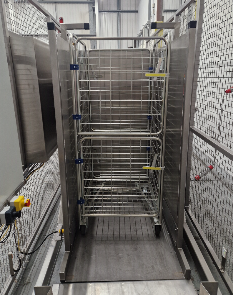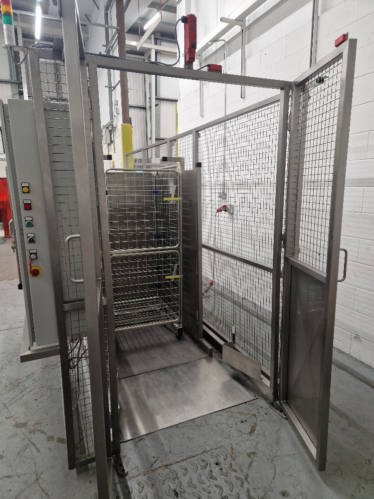 The Laundry Cart Tipper was supplied complete with a safety guard to meet the guidelines of BS EN 14120:2015 Safety of Machinery Guards. The safety guard is constructed from 40 x 40 x 3mm stainless steel box section and 3mm wire, 40mm aperture weld mesh. It encloses the Laundry Cart Tipper to a height of 2200mm on two sides, 1000mm at the tipping side with a pair of interlocked hinged guard doors on the fourth side. The guard doors are electrically and mechanically interlocked to prevent the Laundry Cart Tipper from operating if either door is open. Additionally, the guard doors can only be opened when the lift carriage is at the full down position to prevent access whilst a load is raised.