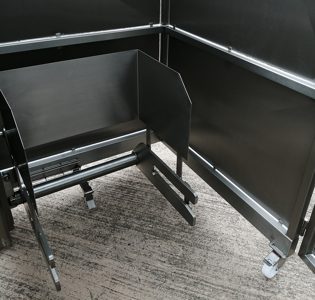 BTM/300/1854/M/G Single Pillar Guarded Dump Buggie Tipper This Guarded Dump Buggie Tipper is designed to lift and tip at a discharge height of 1854mm. The Guarded Dump Buggie Tipper is manufactured from Grade 304 stainless steel, is a welded construction throughout and is designed to be mobile on two fixed and two swivel castors. The lifting is achieved by a ¾” Simplex chain driven by a motor gearbox mounted at the top of the main column. The Guarded Dump Buggie Tipper was fitted with a proximity sensor that will only permit the Guarded Dump Buggie Tippers operation if the tote bin has been correctly loaded. Safety Guard to BS EN 14120:2015 Safety of Machinery Guards This Guarded Dump Buggie Tipper was supplied complete with a safety guard to meet the guidelines of BS EN 14120:2015 Safety of Machinery Guards. The safety guard is constructed from 40 x 40 x 3mm stainless steel box section and 2.0mm stainless steel sheet. It encloses the Guarded Dump Buggie Tipper to a height of 2400mm on three sides, with a hinged guard door on the fourth side. The guard door is electrically and mechanically interlocked preventing the Guarded Dump Buggie Tipper from operating when the door is open. Additionally, the guard door can only be opened when the lift carriage is at the full down position to prevent access whilst a load is raised. Guarded Dump Buggie Tipper Electrical Control This Guarded Dump Buggie Tipper is fitted with an IP65 Stainless Steel Control Panel which is mounted on the main column at a convenient position to give good maintenance access under the Provision and Use of Work Equipment Regulation 1998 (PUWER). Upper and Lower end of travel limit switches are positioned to prevent inadvertent adjustment or damage but are easily adjustable by trained personnel for fine adjustment on site. The control panel incorporates the following controls; Up, Down, Guard Release, Emergency Stop and a Reset Facility. The Guarded Dump Buggie Tipper operation is latched so that pressing the ‘Up’ push button once will raise the lift to the full tip position. Once the product has been discharged, pressing the ‘Down’ push button once will return the Guarded Dump Buggie Tipper to the full down position. The control panel has a volt free pair of contacts which can be used to connect a ‘Call to Run’ signal if required.